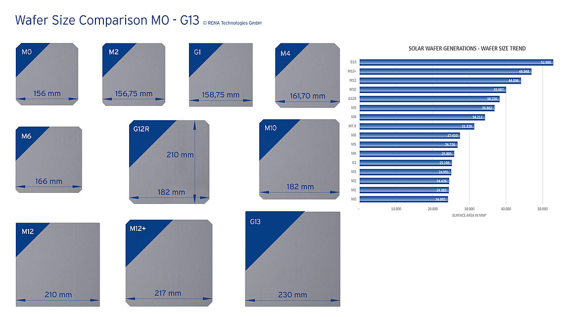 Even if silicon solar wafers have been growing ever since, for quite a long period of time wafers have remained at a length of 156.75 mm, the so called generation M2. In the last years the photovoltaics industry is undergoing a rapid change from the M2 standard to larger wafer sizes. As manufacturers are keen to bring down the cost per watt on module level, new larger wafer sizes have been introduced. PV-manufacturers are increasingly implementing larger sizes like G12R wafers with a length of 210 mm x 182 mm, M12 and even G13 with a length of 230 mm and various sizes in between. This might be the start of a new age in the solar industry.